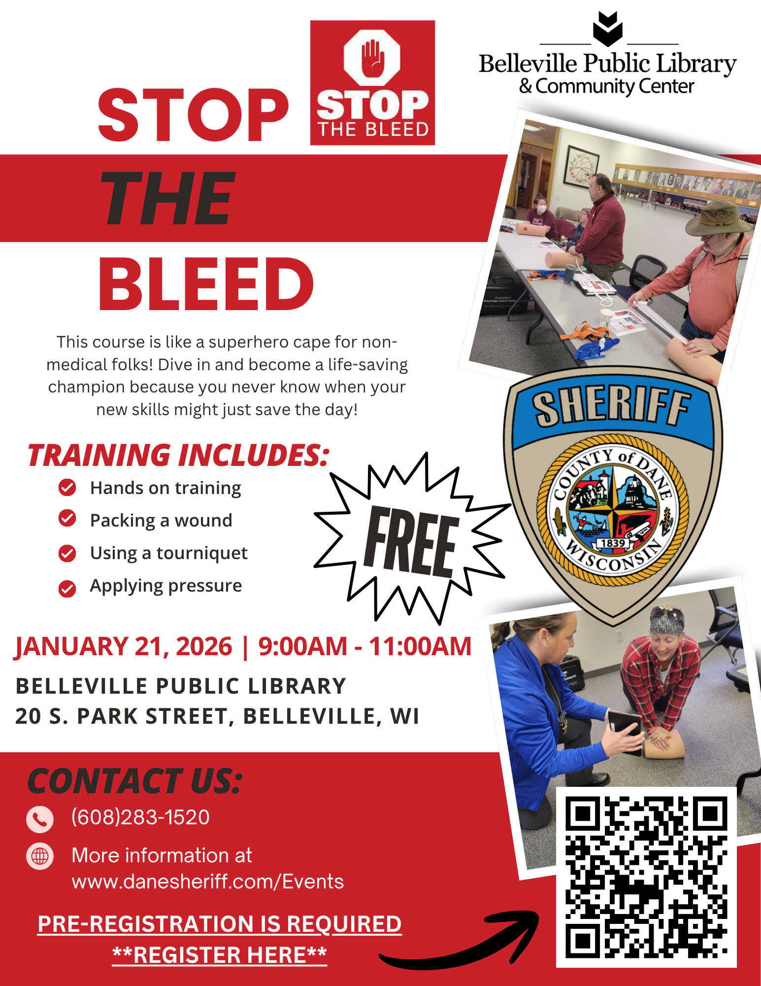 The Dane County Sheriff’s Office and Belleville Public Library are hosting a FREE Stop The Bleed Course at the Belleville Public Library on Wednesday, January 21, 2026. This course is like a superhero cape for non-medical folks! Dive in and become a life-saving champion because you never know when your new skills might just save the day! The training includes: hands on training, applying pressure, packing a wound and using a tourniquet.